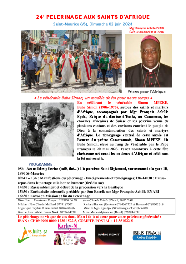 Le Pèlerinage annuel aux Saints d'Afrique aura lieu le dimanche 2 juin 2024, à St-Maurice en Valais. L'oeuvre du prêtre camerounais Simon Mpeke, connu sous le nom de Baba Simon, sera évoquée en matinée. Bienvenue aux amies et amis de l'Afrique! Précisions et affiche sur le site